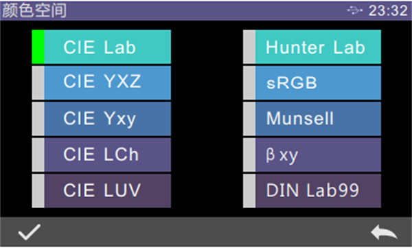 在主菜單下點擊“顏色空間”進入顏色空間界麵,在顏色空間界麵中選擇相應的顏色空間,然後點擊“√”確認完成顏色空間設置。