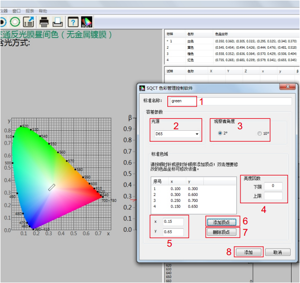 如圖5所示,在位置1處輸入標樣名稱,位置2處選擇光源種類(默認為D65),位置3處選擇觀察者角度(默認為2度),位置4處輸入亮度因數(除熒光物質外,普通反射樣品亮度因數大於0小於1,即0<β<1)。在位置5處輸入色品坐標點,然後點擊“添加頂點”按鈕,則新輸入的色品坐標點出現在標準色域框內,重複上述步驟,依次輸入各色品坐標點;對於輸入錯誤的色品坐標點,先在標準色域框內選中,然後點擊“刪除頂點”按鈕,則刪掉該頂點。全部輸入完畢,點擊位置8處“添加”按鈕,則完成“多邊形-容差標樣”建立。