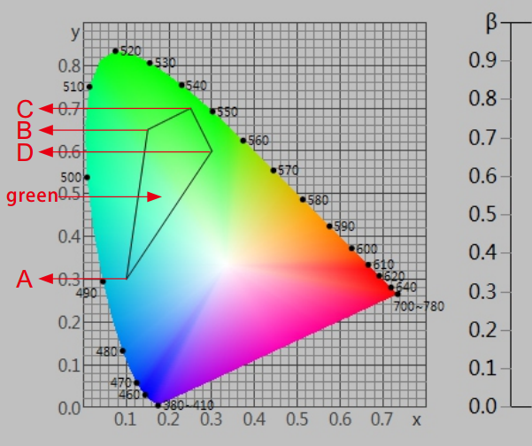在《GB 2893安全色》、《GB/T 18833道路交通反光膜》等相關標準中,通常給出一塊顏色區域(多個色品坐標點)和亮度因數要求,在D65/A光源和45/0幾何條件下,判定樣品是否落在對應的顏色區域內,借此判定樣品是否滿足標準規定的色度要求。由於顏色區域為多邊形,如下圖所示,導致使用普通的分光測色儀無法完成判定。NS808測色儀配合SQCT軟件的交通路標測量模塊則可以輕鬆解決這方麵的問題。