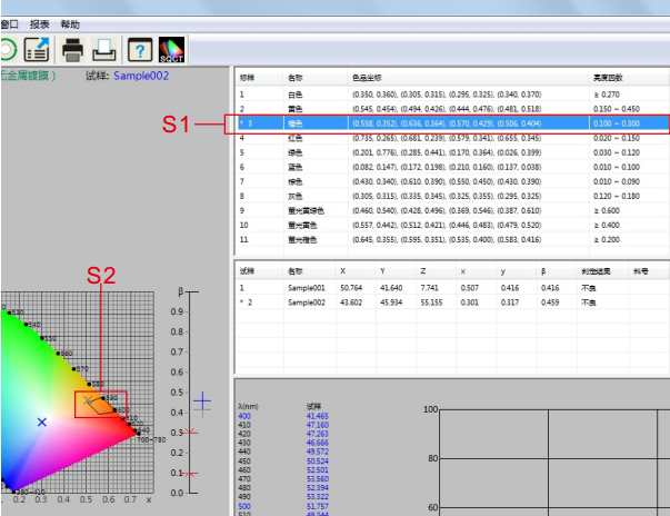 雙擊標樣區域的藍色,如圖12中是S3所示部分,使藍色為當前標樣,藍色多邊形-容差標樣(《GB/T 18833-2012道路交通反光膜樣》規定的藍色區域)則顯示在S4部分。