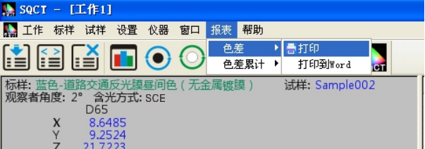 對試樣的測試結果可以通過打印菜單生成測試報表,選中要打印的試樣和標樣,執行“報表->色差->打印/打印到word”或“報表->色差累計->打印/打印到word”,將測試結果打印出來,如圖15、16所示。