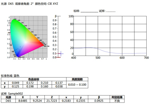 譬如如何判定藍色試樣是否在《GB/T 18833-2012道路交通反光膜樣》所規定的藍色區域內(無金屬鍍層,晝間反光膜顏色),按照下麵的步驟,將依次完成測量和判定。