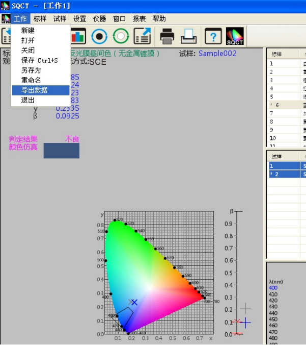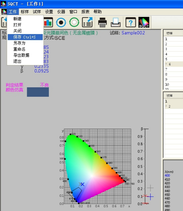 SQCT直接將《GB/T 18833-2012道路交通反光膜樣》的多邊形顏色區域做入軟件中,可以直接從菜單中選擇,“標樣->道路交通反光膜GB/T 18833->晝間色(無金屬鍍膜)”如圖11所示。