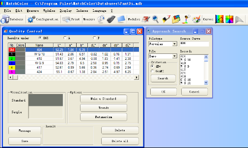 如果在色庫中已經存儲了許多過去曾經做過的顏色,使用這個功能,係統就能在色庫中尋找同標準色接近的顏色,並且把尋找到的顏色按照色差值由小到大進行排列,顯示出來。